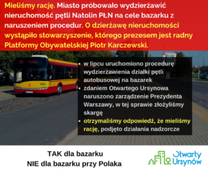Dzierżawa nieruchomości, na której jest obecnie zlokalizowana pętla autobusowa, ma związek z próbą przeniesienia w to miejsce Bazarku na Dołku. Jesteśmy zbulwersowani, iż władze Warszawy wbrew mieszkańcom chcą zlikwidować potrzebną pętlę autobusową. W jej miejsce miałby zostać przeniesiony Bazarek na Dołku, który jest zarządzany przez radnego Platformy Obywatelskiej Piotra Karczewskiego (prezes stowarzyszenia kupców). Ta sytuacja tylko pogłębia istniejący konflikt interesów towarzyszący tej sprawie. Władze miasta powinny zachować bezstronność i działać na rzecz interesu publicznego, a nie prywatnego przedsięwzięcia biznesowego jednego z ursynowskich radnych. Bazarek powinien istnieć i już dawno powinien zostać przeniesiony do innej lokalizacji, tym bardziej, że prace dotyczące POW już trwają.